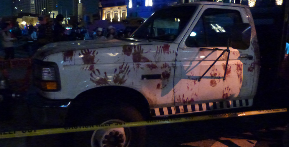 Every night running up to Halloween the theme park transforms into a horror show as zombies of all shapes, sizes and er... 'preferred weapons' are set loose to scare the guests and terrorise the streets. Highlights included abandoned cars scattered around the park where groups of hungry zombies drag in an unwitting victim and stage ripping them to pieces (or nibbling on a couple limbs). It all sounds horrific as I'm writing this down but it was such an amazing experience and so well done you really do feel like a zombie apocalypse was happening. Oh, and for those of you who are squeamish or worried about getting manhandled by the undead don't worry, they won't touch you or bother you more then making you jump. Anyone they do grab is a trained member of staff (or a fellow zombie) and just another part of the show! You may however get a bit a bit wet if you're as unlucky as me! A couple HUGE Zombie monsters also roam the park and waddle after guests, what I didn't know was they can spit water and gunk at you if you get too close! So there's me trying to get a selfie and next thing I know I've been spat on by a 7ft Chuckie look-alike. Grim.